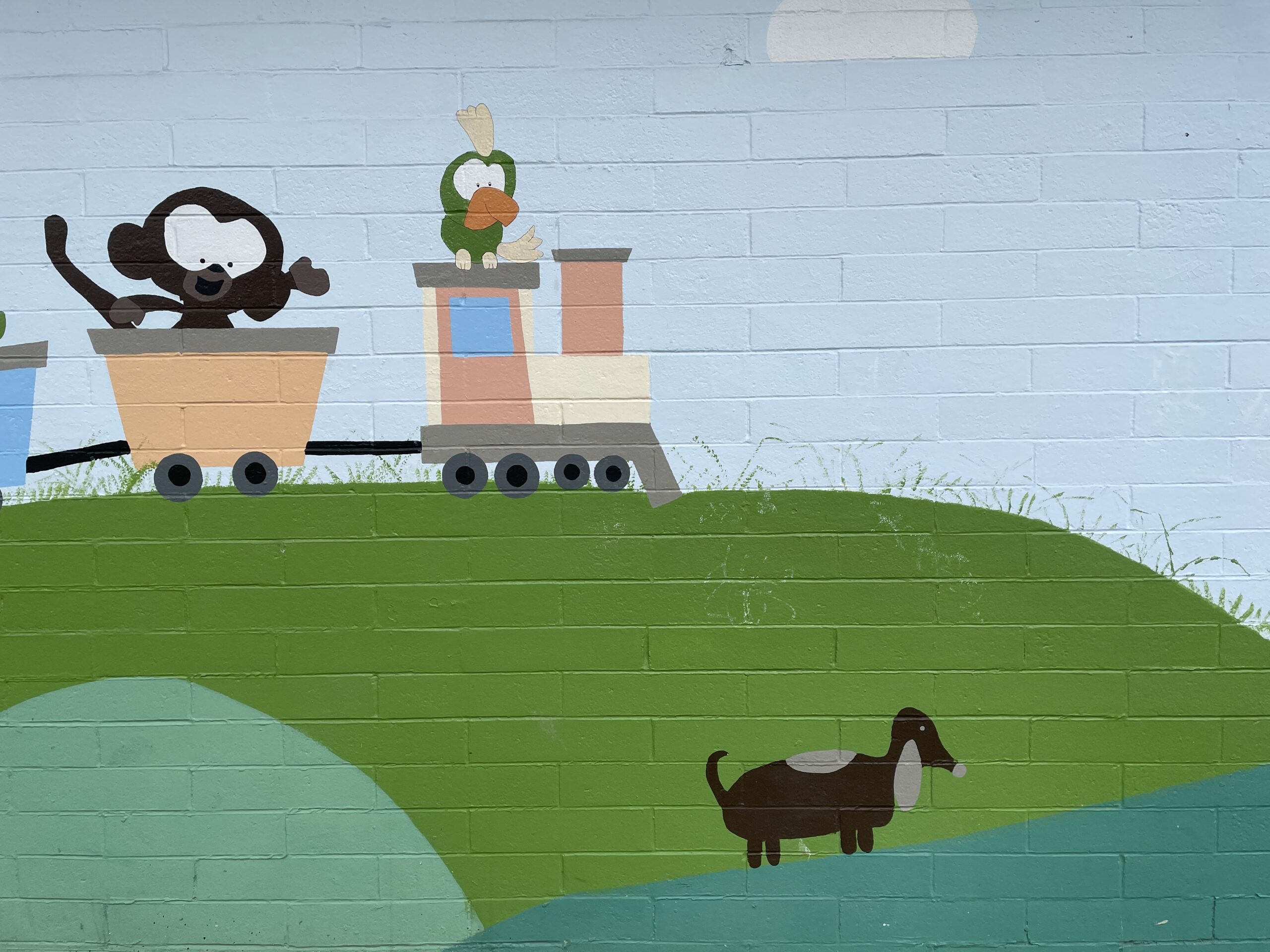 I meant to post this the other day, this is art on the side of a building housing a daycare centre. The wiener dog1Yes, I know they are Dachsunds. They will always be wiener dogs to me. looks very sad, maybe because the other animals are riding a train and it has to walk on its stubby li’l legs.