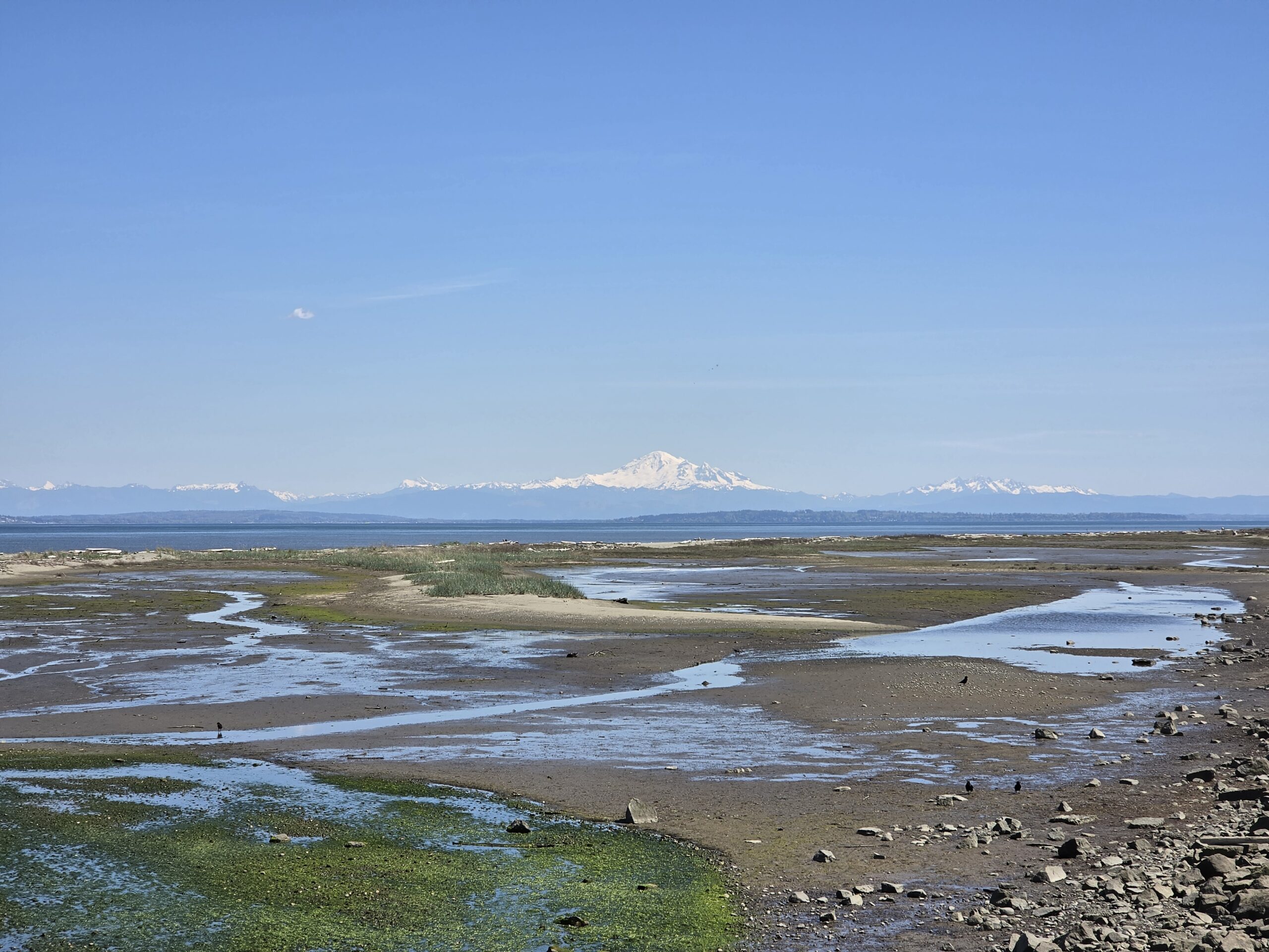 Very low tide, with Mt. Baker in the background.