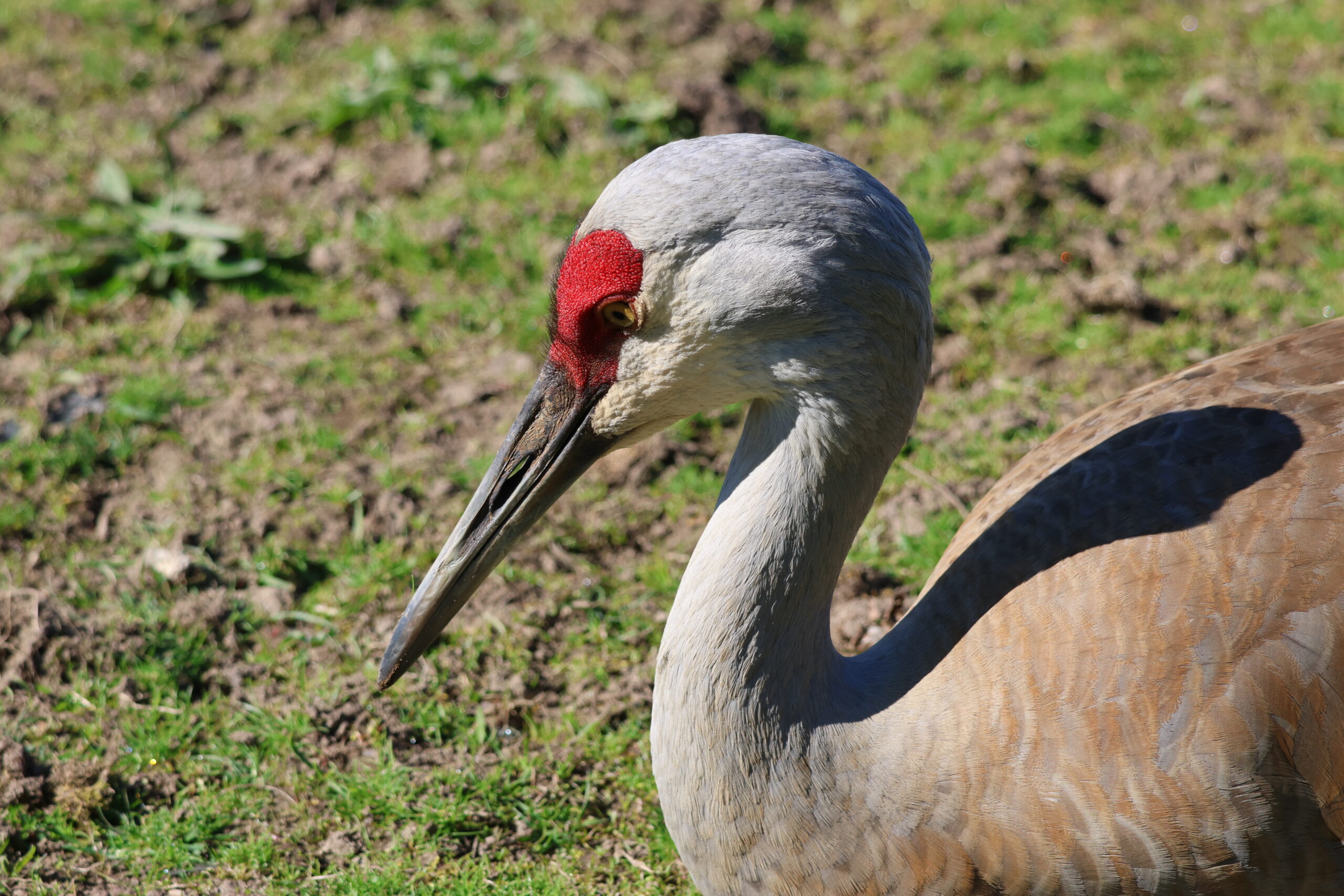 A Sandhill Crane, sitting on the grass near the Reifel entrance.
