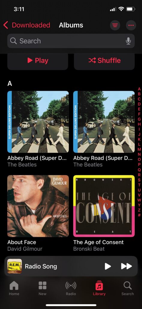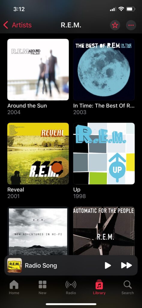 And it turns out two R.E.M. albums are missing, Accelerate (2008) and Collapse Into Now (2011). These are albums I own, not just streaming ones I’ve downloaded. And they are albums I have listened to many times on my iPhone (Accelerate, in particular). I have not touched my music library in any way. Where did they go? Only Apple knows. Actually, Apple probably doesn’t know. But the bigger question is: Why is Apple disappearing albums I’ve actually purchased? It’s like the company is actively trying to push me away.
