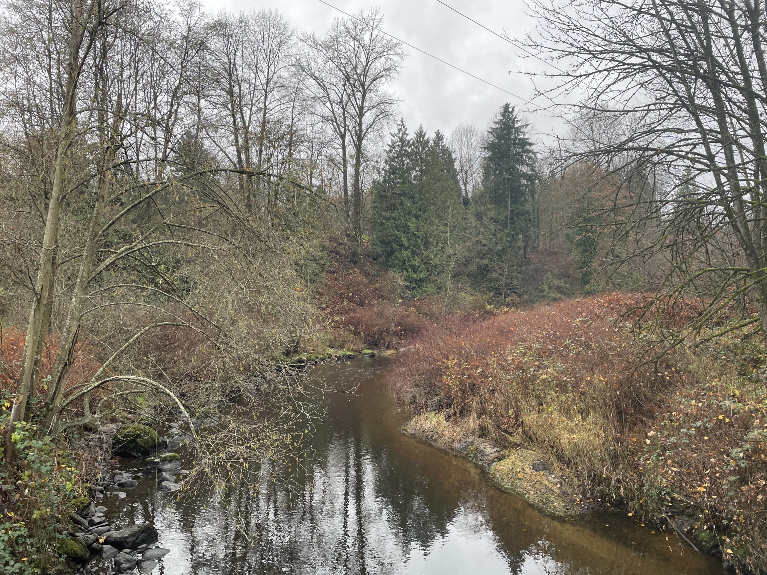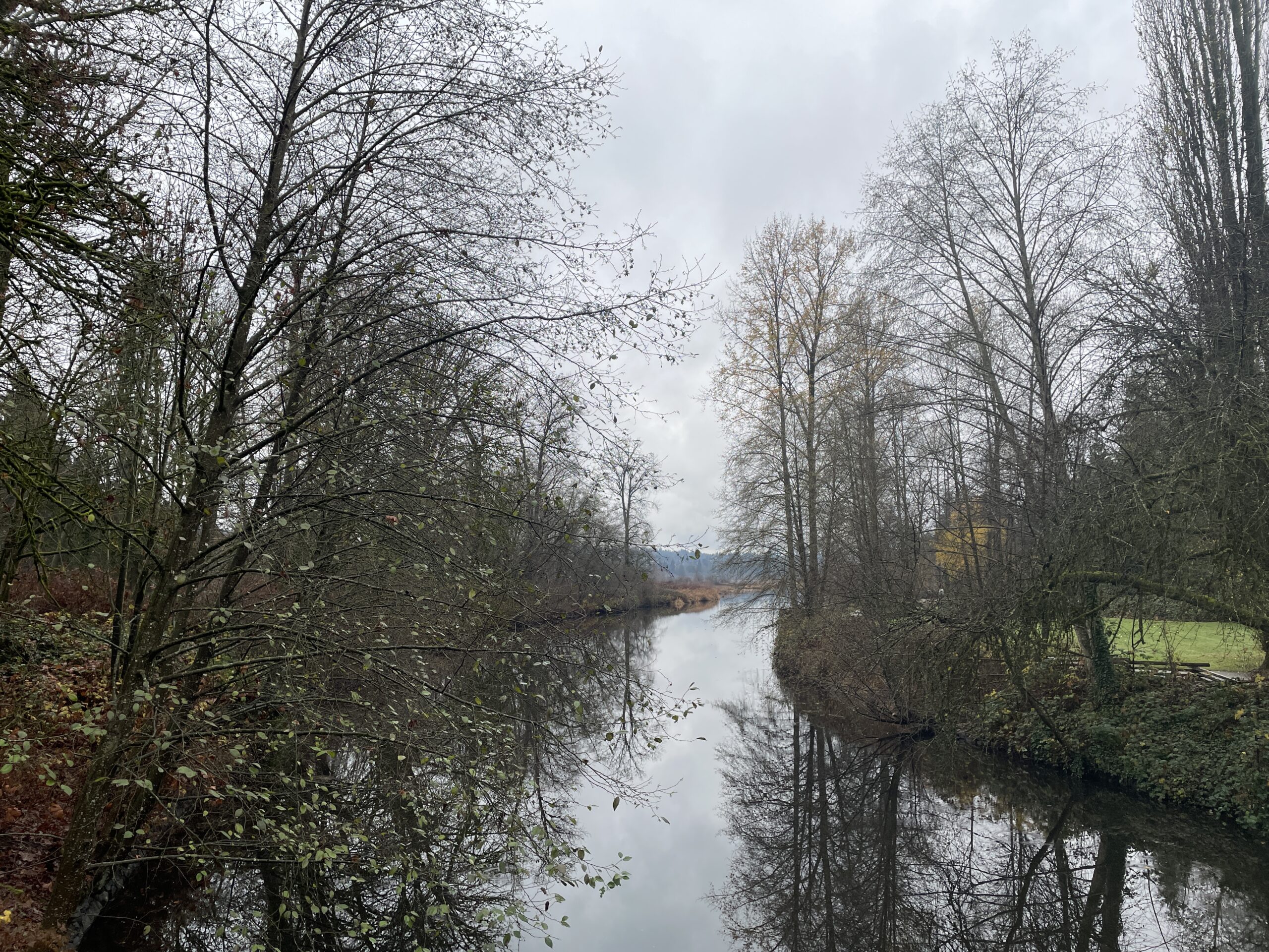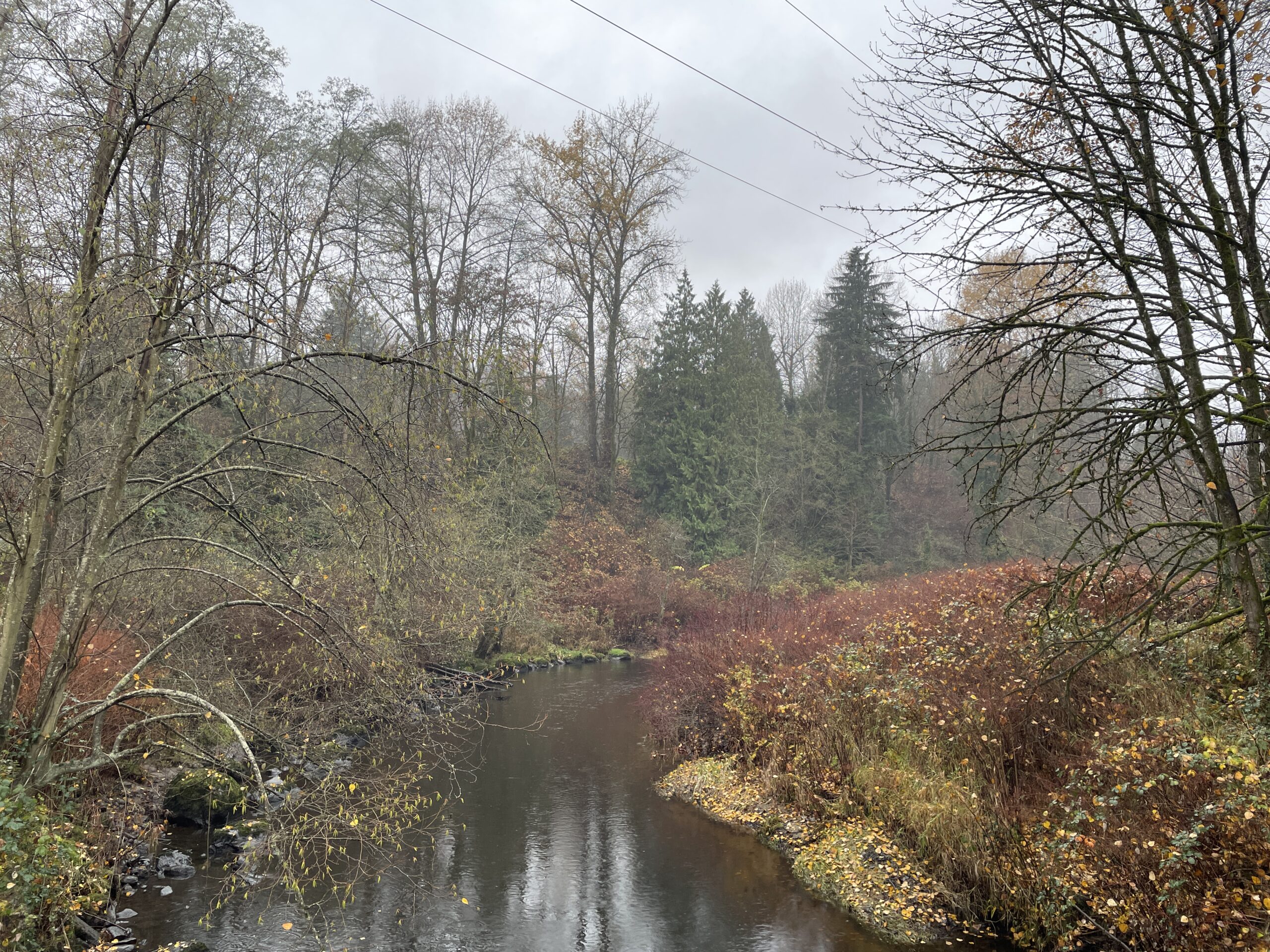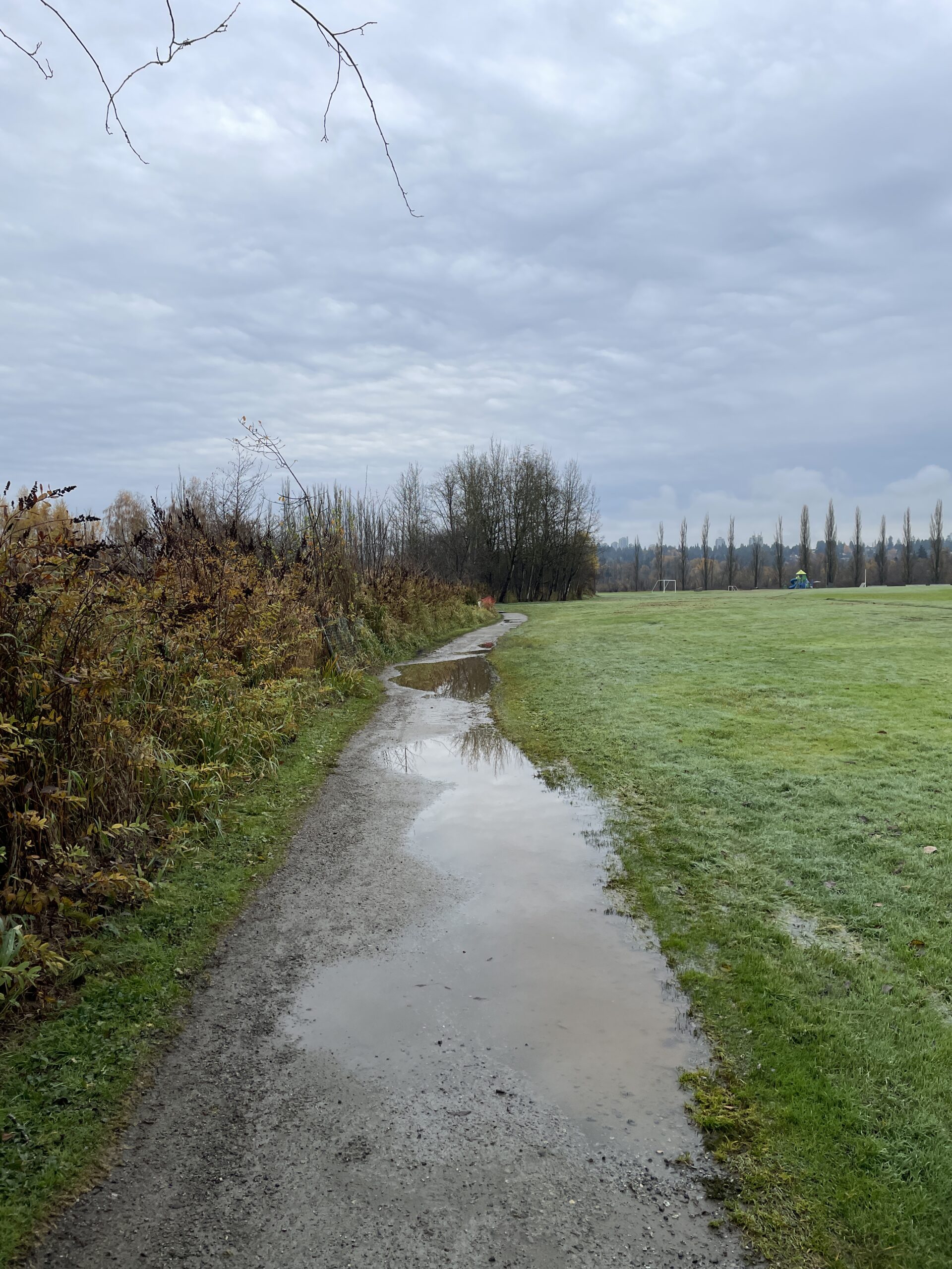 As mentioned, conditions were relatively mild. I probably only needed two layers, but three did not prove to be uncomfortable. The trail was generally in good shape, though the branches (and twigs) were indeed out, scattered all over the place. I guess yesterday’s storm had something to do with the debris. I finished the run and was perfectly dry, then had to face Puddle Town by the sports fields and ending up spraying mud up one leg and generally getting my feet quite wet, because the puddles are too big to avoid and the edges are all soft and murky. I will be writing to Metro Vancouver, because I’ve been running here for 14 years and they have never addressed the regular flooding on this section of trail.