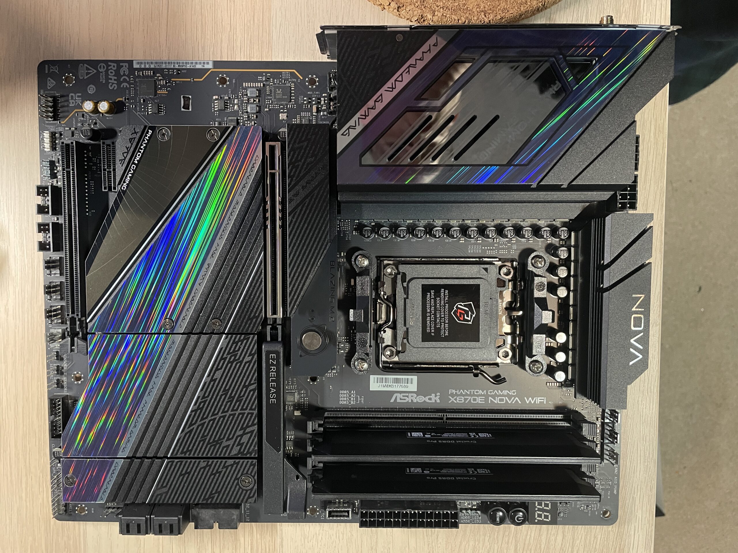 All the parts are gathered. I cleared a space. I grounded myself, both against static and mentally. I put down the motherboard on the space I’d cleared (I planned to install everything on the motherboard before putting it in the case, save for the video card). I peeled all the plastic film off parts of it, something I’d never had to do on a motherboard before. I installed the ram (I used my iPhone’s Magnifier app to read the correct slot layout on the PCB).